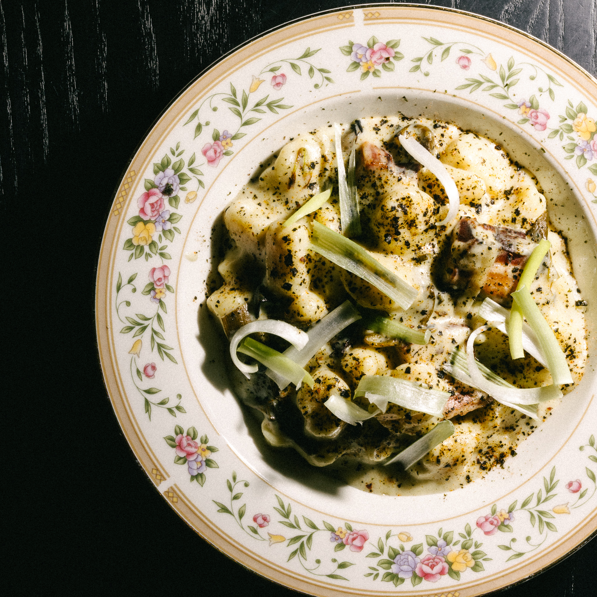 Scallion, Cheese Sauce, Bacon Lardon, Nori Spice