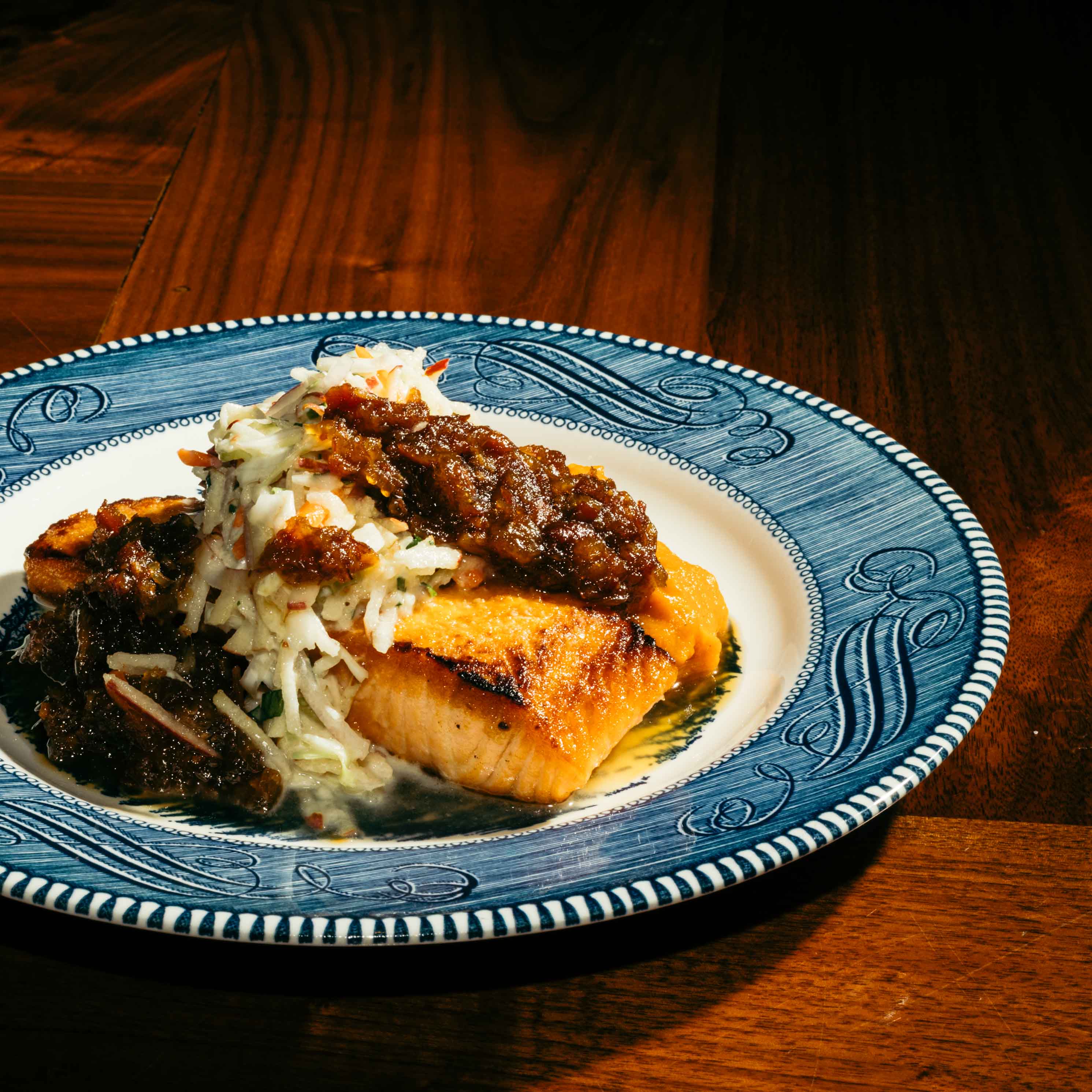 Maple Whipped Sweet Potato, Bacon & Onion Agrodolce, Apple Slaw
